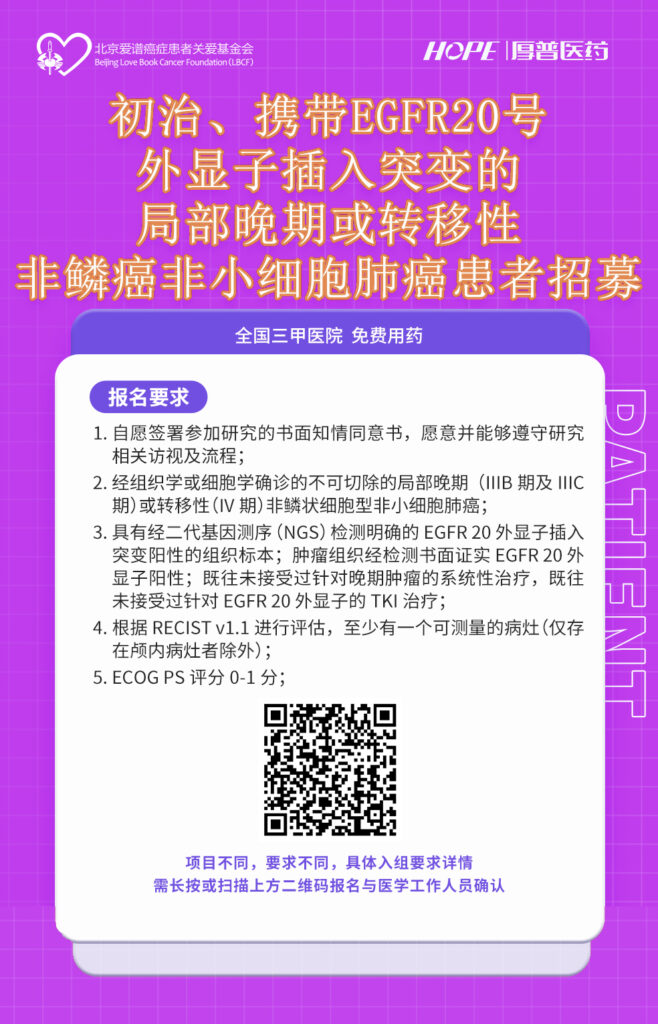 亲爱的病友们,在这条充满挑战的道路上,我们与您并肩同行。北京爱谱癌症患者关爱基金会携手厚普医药,诚挚推出“既往未接受过系统性治疗、携带EGFR 20号外显子插入突变的局部晚期或转移性非鳞癌非小细胞肺癌招募计划”,在全国顶尖三甲医院,为您开启免费药物治疗的绿色通道,让希望的曙光照亮您的康复之路。