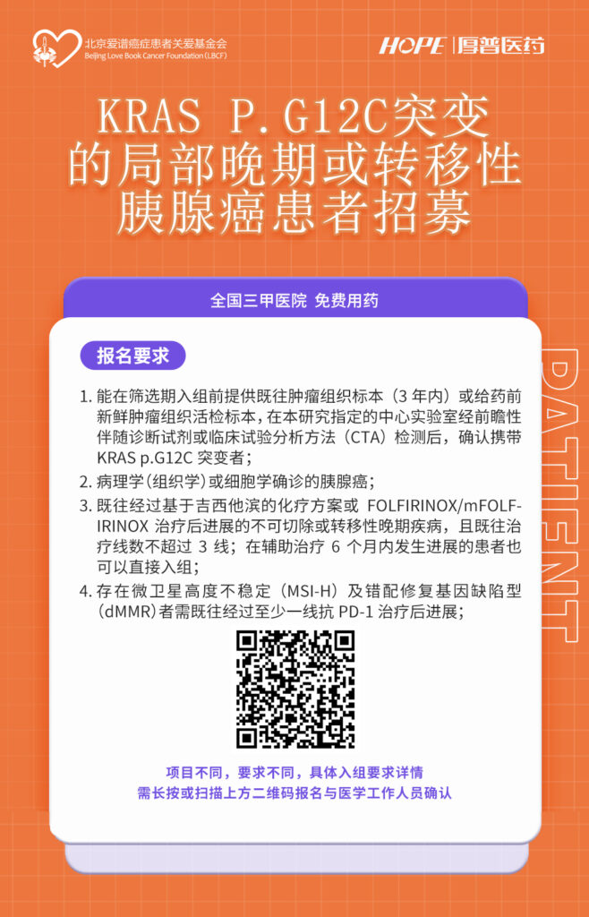 亲爱的病友们,在这条充满挑战的道路上,我们与您并肩同行。北京爱谱癌症患者关爱基金会携手厚普医药,诚挚推出“KRAS p.G12C突变的局部晚期或转移性胰腺癌患者招募计划”,在全国顶尖三甲医院,为您开启免费药物治疗的绿色通道,让希望的曙光照亮您的康复之路。