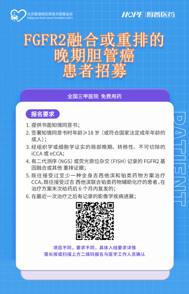 亲爱的病友们,在这条充满挑战的道路上,我们与您并肩同行。北京爱谱癌症患者关爱基金会携手厚普医药,诚挚推出“携带 FGFR2 融合或重排的晚期胆管癌患者招募计划”,在全国顶尖三甲医院,为您开启免费药物治疗的绿色通道,让希望的曙光照亮您的康复之路。