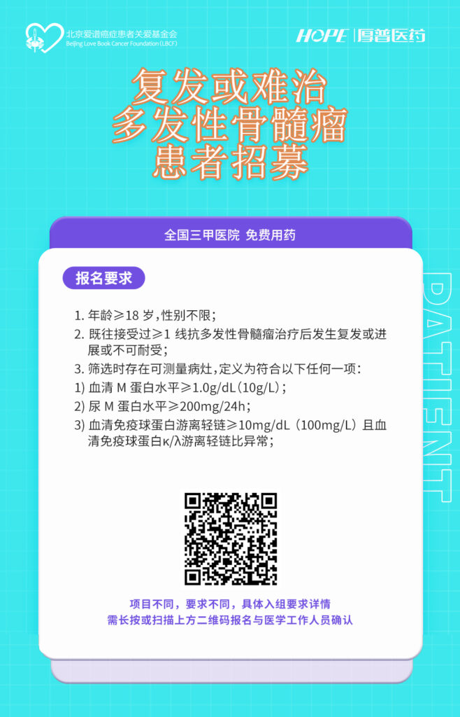 亲爱的病友们,在这条充满挑战的道路上,我们与您并肩同行。北京爱谱癌症患者关爱基金会携手厚普医药,诚挚推出“复发或难治多发性骨髓瘤患者招募计划”,在全国顶尖三甲医院,为您开启免费药物治疗的绿色通道,让希望的曙光照亮您的康复之路。