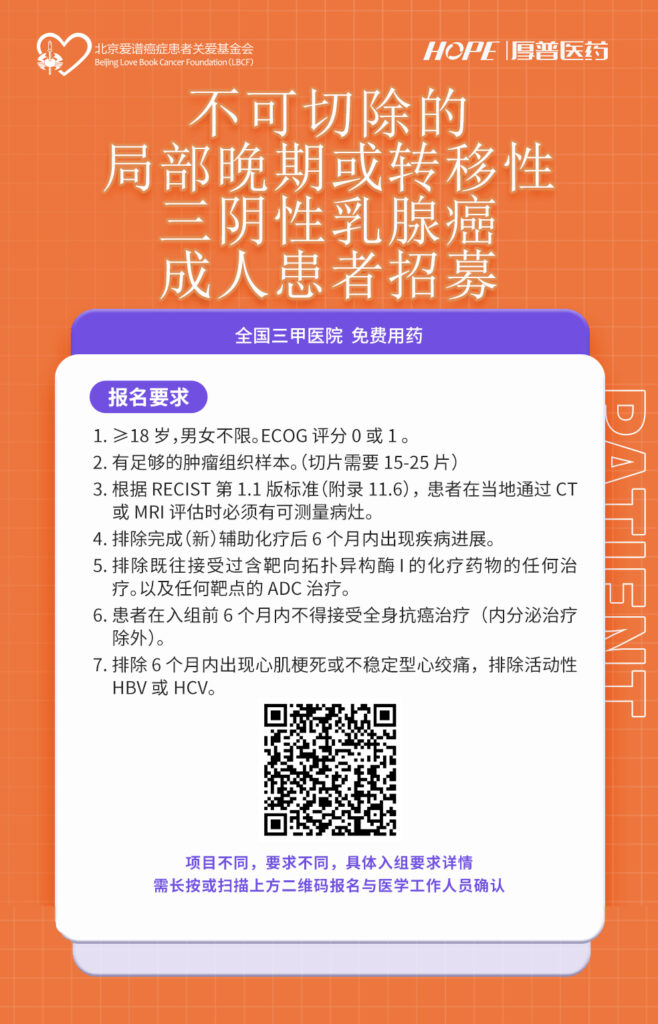 亲爱的病友们,在这条充满挑战的道路上,我们与您并肩同行。北京爱谱癌症患者关爱基金会携手厚普医药,诚挚推出“既往未经治疗的局部晚期不可手术或转移性三阴乳腺癌患者招募计划”,在全国顶尖三甲医院,为您开启免费药物治疗的绿色通道,让希望的曙光照亮您的康复之路。
