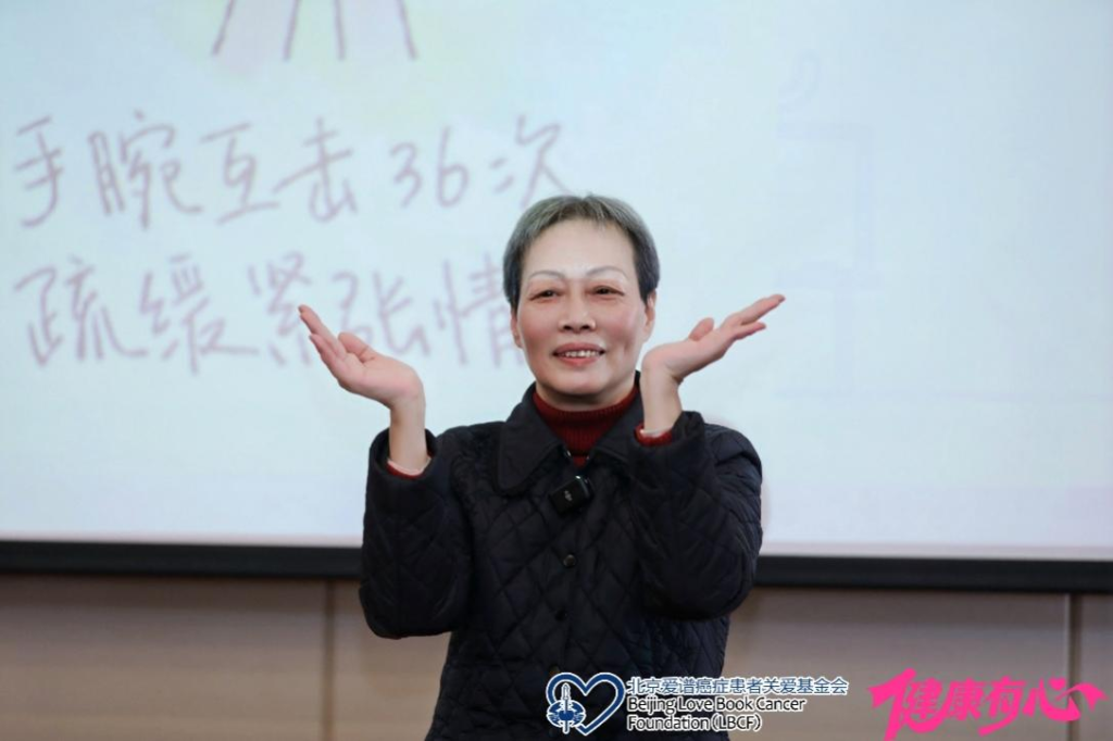随后,高文平女士以“在伤痕处生长出力量”为题,开展了“用‘心’关爱:全方位多角度支持患者心理康复”专题科普讲座。她结合亲身经历,分享了自己如何将重大心理创伤转化为心理韧性,从而支撑她度过身患重疾与失去至亲的艰难时期。高文平女士指出,康复并非消除伤痕,而是学会与之共处,并从中获取应对生活的力量。讲座中,她系统讲解了情绪调节对康复的影响,并结合理论与实用方法,现场带领大家体验“十巧手指操”,帮助患者缓解焦虑,提升自我调节能力。