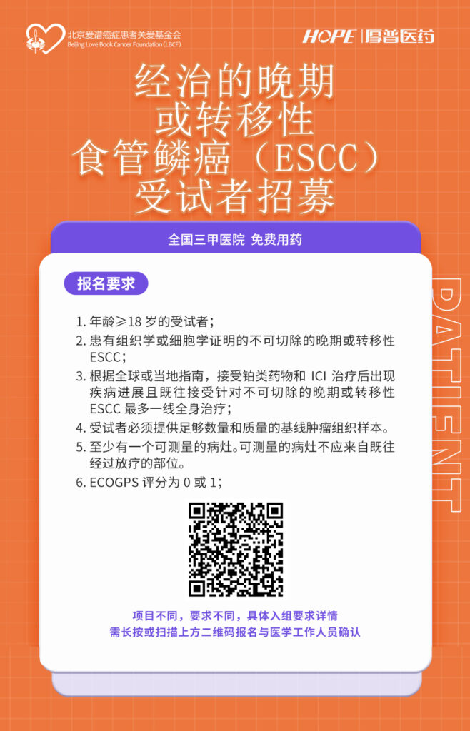 生命新章,共赴希望之旅 —— 招募晚期或转移性食管鳞癌(ESCC)患者